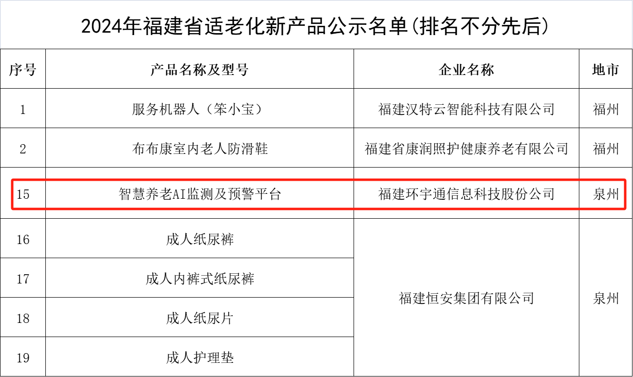 2024年11月19日,2024年福建省适老化新产品公示名单公布,全省有24款产品位列名单,泉州共有五款产品入选。其中HJC黄金城集团依托技术积累和创新能力所推出的“智慧养老AI监测及预警平台”入选该名单。这一荣誉不仅是对公司在“AI+医疗康养”领域的长期努力和贡献的肯定,更是对未来持续创新与高质量开展的激励。